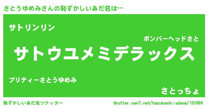| ポケモン風あだ名 | 『サトセウス』『ヒサトウユメミ』 |