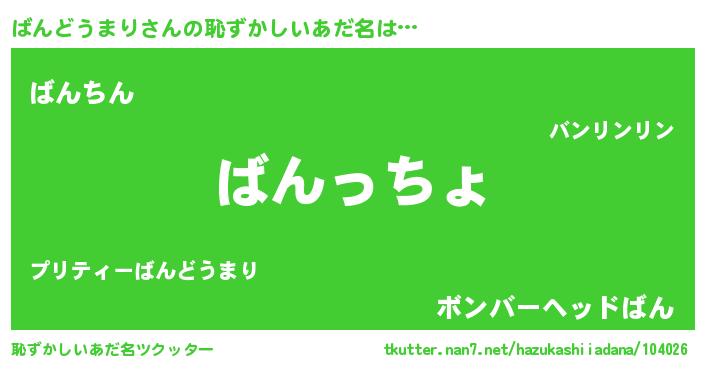 | 男性向けラノベタイトル風あだ名 | 『ばんどうまり~年齢イコール彼女いない歴の魔法使い~』 |