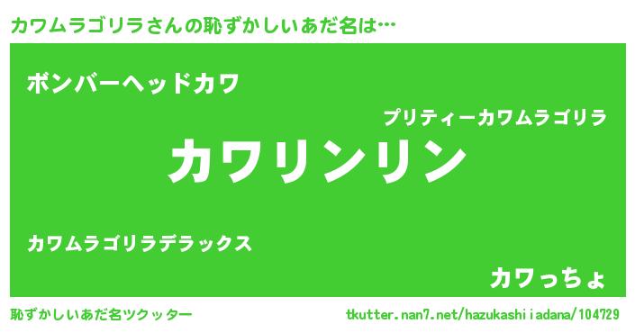 | 男性向けラノベタイトル風あだ名 | 『カワムラゴリラの嫁は女の子じゃないと思った?』 |
