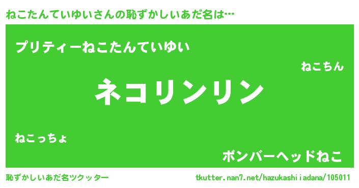 | 男性向けラノベタイトル風あだ名 | 『ねこたんていゆいの嫁は女の子じゃないと思った?』 |