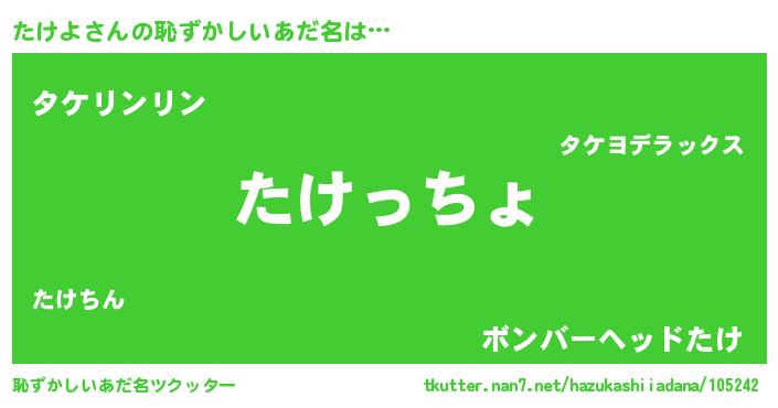| 男性向けラノベタイトル風あだ名 | 『この素晴らしい世界にたけよを!』 |