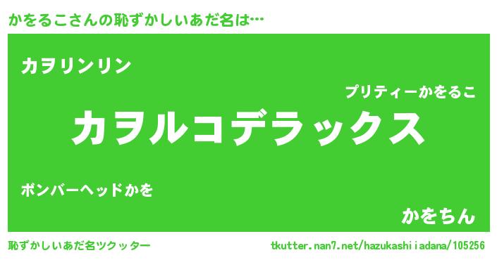 かをるこさんの恥ずかしいあだ名は… 『カヲルコデラックス』『カヲリンリン』『かをちん』 ツクッター #恥ずかしいあだ名ツクッター http://tkutter.nan7.net/hazukashiiadana/105256/