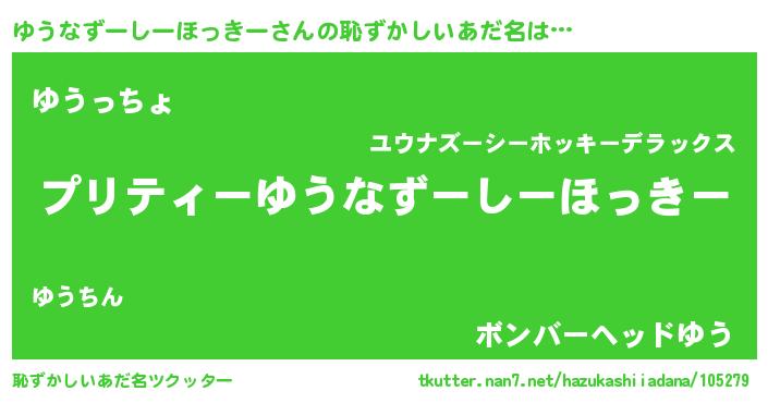 | 男性向けラノベタイトル風あだ名 | 『ゆうなずーしーほっきー~年齢イコール彼女いない歴の魔法使い~』 |