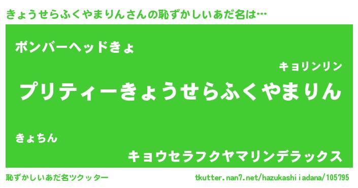 | 男性向けラノベタイトル風あだ名 | 『キョウセラフクヤマリンスレイヤー』 |