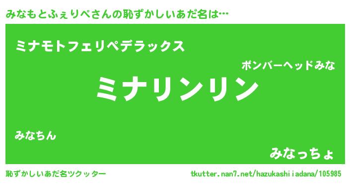 | 女子向けラノベタイトル風あだ名 | 『みなもとふぇりぺの卵を拾いまして』 |