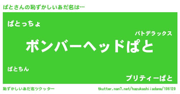 | 意味不明あだ名 | 『住所不定無職ぱと(3歳)』『ペロリンぱと』 |