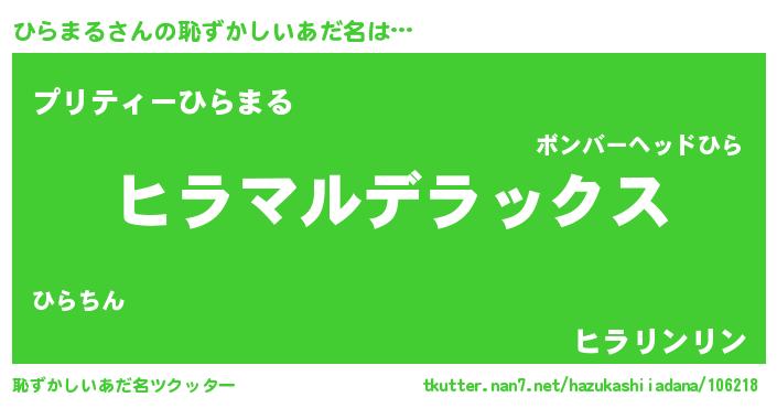 | 男性向けラノベタイトル風あだ名 | 『Re:ひらまるから始める異世界生活』 |