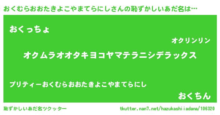 | 意味不明あだ名 | 『自称おくむらおおたきよこやまてらにし』 |