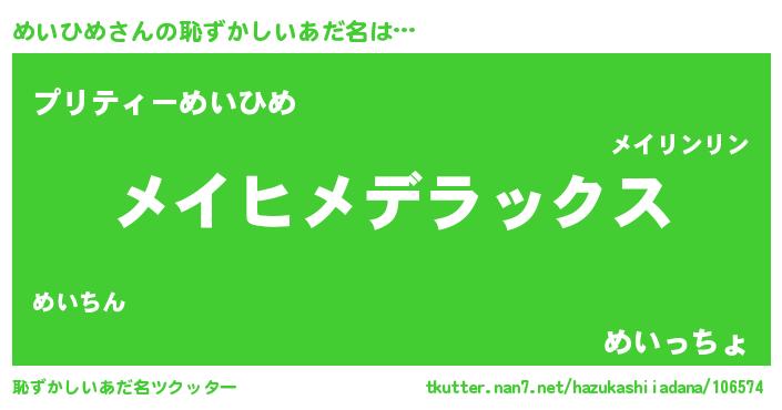 | 男性向けラノベタイトル風あだ名 | 『Re:めいひめから始める異世界生活』 |