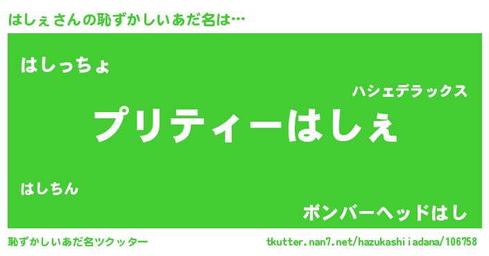 | 意味不明あだ名 | 『ペロリンはしぇ』『はしぇフォーエバー』 |