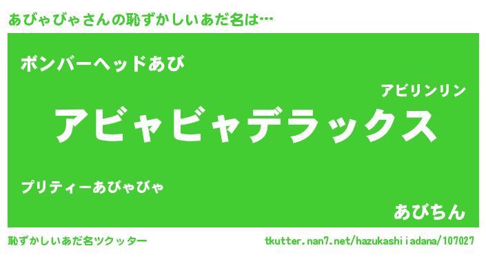あびゃびゃさんの恥ずかしいあだ名は… 『アビャビャデラックス』『ボンバーヘッドあび』『あびちん』 ツクッター #恥ずかしいあだ名ツクッター http://tkutter.nan7.net/hazukashiiadana/107027/