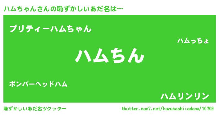 | 男性向けラノベタイトル風あだ名 | 『ハムちゃん~年齢イコール彼女いない歴の魔法使い~』 |