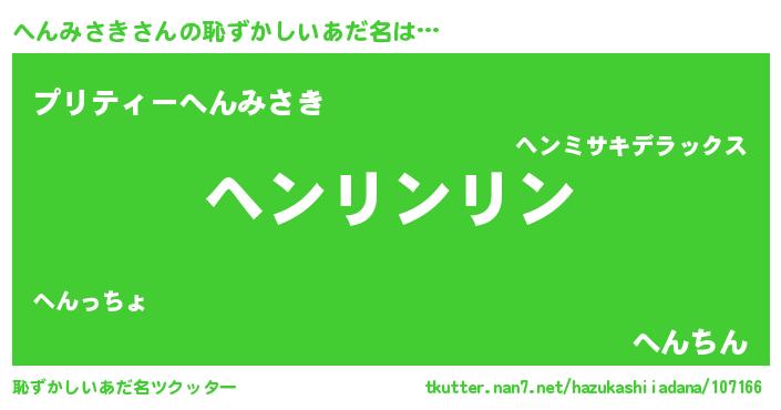 | 胡散臭い通販商品みたいなあだ名 | 『信頼と実績のサプリメント…その名も「へんみさき」』 |