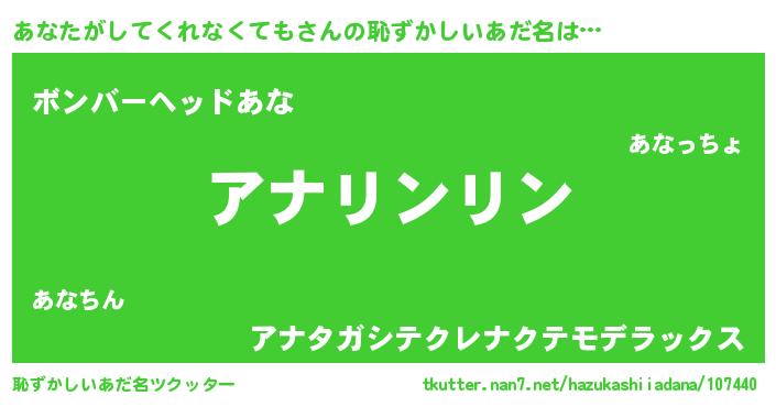 あなたがしてくれなくてもさんの恥ずかしいあだ名は… 『アナリンリン』『ボンバーヘッドあな』『アナタガシテクレナクテモデラックス』 ツクッター #恥ずかしいあだ名ツクッター http://tkutter.nan7.net/hazukashiiadana/107440/