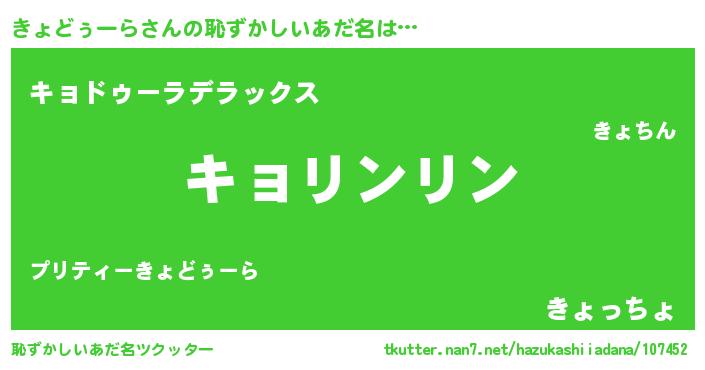 | ヒーロー風カッコイイあだ名 | 『幻影騎士キョ』『究極戦士キョドゥーラ』 |