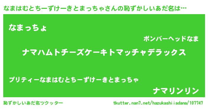 | 伝説のあだ名 | 『秘められし忍者なまはむとちーずけーきとまっちゃ』 |