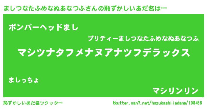 | 女子向けラノベタイトル風あだ名 | 『ましつなたふめなぬあなつふなんてお断りですっ。』 |