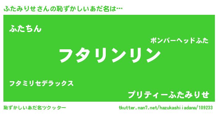 | 女子向けラノベタイトル風あだ名 | 『ふたみりせ様がみてる』 |