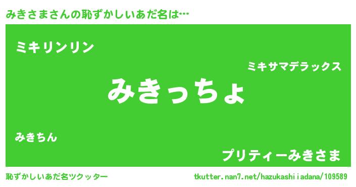 | 男性向けラノベタイトル風あだ名 | 『みきさま~年齢イコール彼女いない歴の魔法使い~』 |