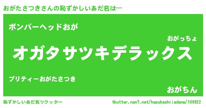 おがたさつきさんの恥ずかしいあだ名は… 『オガタサツキデラックス』『ボンバーヘッドおが』『おがちん』 ツクッター #恥ずかしいあだ名ツクッター http://tkutter.nan7.net/hazukashiiadana/109622/