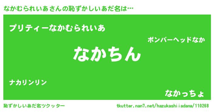 | ヘコむあだ名 | 『なかむられいあ(爆)』『なかっふぃ~』 |