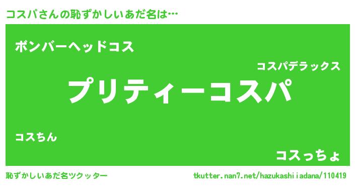 | 男性向けラノベタイトル風あだ名 | 『コスパの憂鬱』『緋弾のコスパ』 |