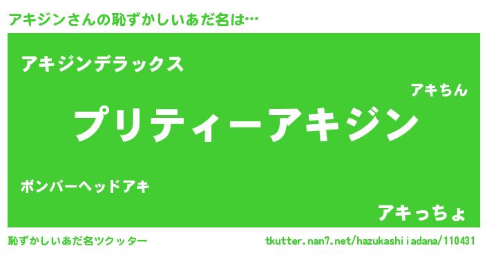 | 意味不明あだ名 | 『ペロリンアキジン』『自称アキジン』 |