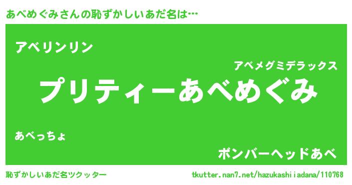 | 胡散臭い通販商品みたいなあだ名 | 『モテモテ間違いなしブレスレット…その名も「あべめぐみ」』 |