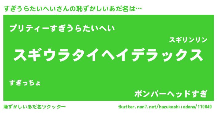 | 男性向けラノベタイトル風あだ名 | 『魔弾の王とすぎうらたいへい』 |