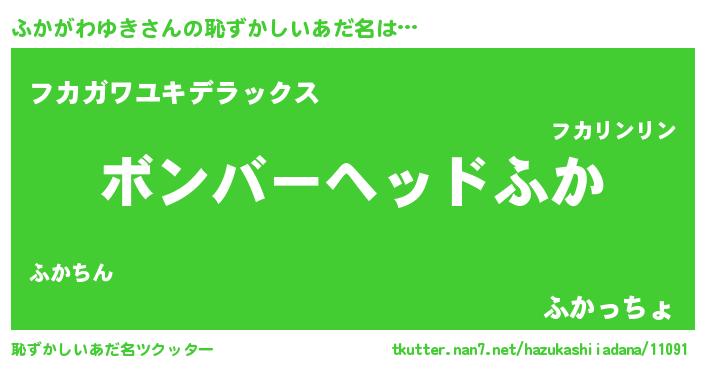 | 男性向けラノベタイトル風あだ名 | 『ふかがわゆき~年齢イコール彼女いない歴の魔法使い~』 |