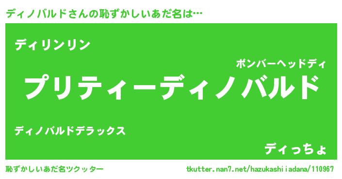 | 女子向けラノベタイトル風あだ名 | 『ディノバルドが死なない童話 林檎のディノバルドの診療簿』 |