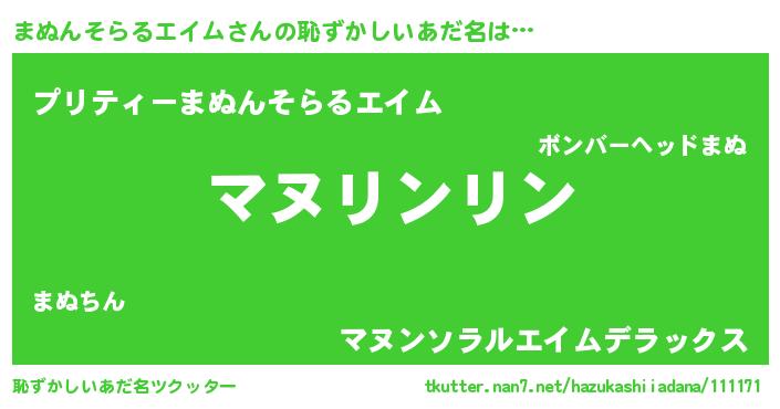 | 欧米人風あだ名 | 『ダレノガレまぬんそらるエイム』 |