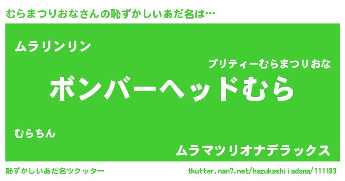 むらまつりおなさんの恥ずかしいあだ名は… 『ボンバーヘッドむら』『ムラリンリン』『ムラマツリオナデラックス』 ツクッター #恥ずかしいあだ名ツクッター http://tkutter.nan7.net/hazukashiiadana/111183/