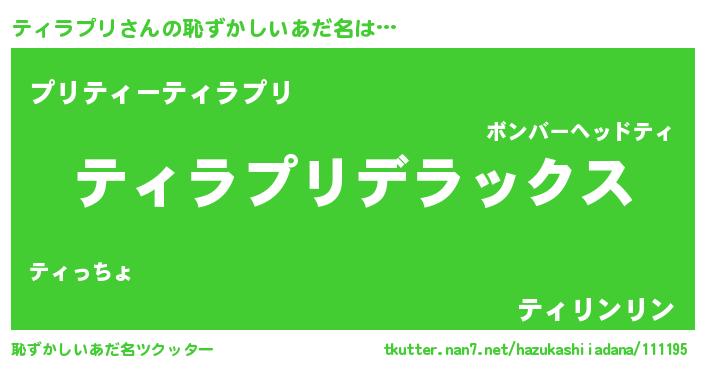| 意味不明あだ名 | 『自称ティラプリ』『ペロリンティラプリ』 |