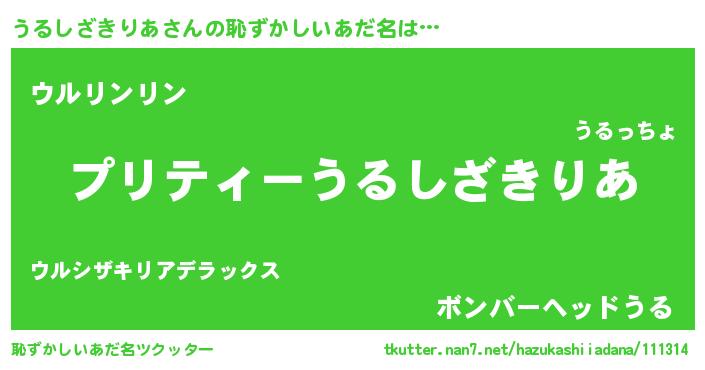 | ヘコむあだ名 | 『うるにゅー』『うるっ子』 |