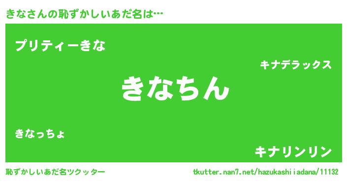 きなさんの恥ずかしいあだ名は… 『きなちん』『プリティーきな』『キナリンリン』 ツクッター #恥ずかしいあだ名ツクッター http://tkutter.nan7.net/hazukashiiadana/11132/