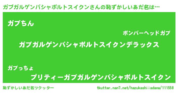 | 男性向けラノベタイトル風あだ名 | 『Re:ガブガルゲンバシャボルトスイクンから始める異世界生活』 |