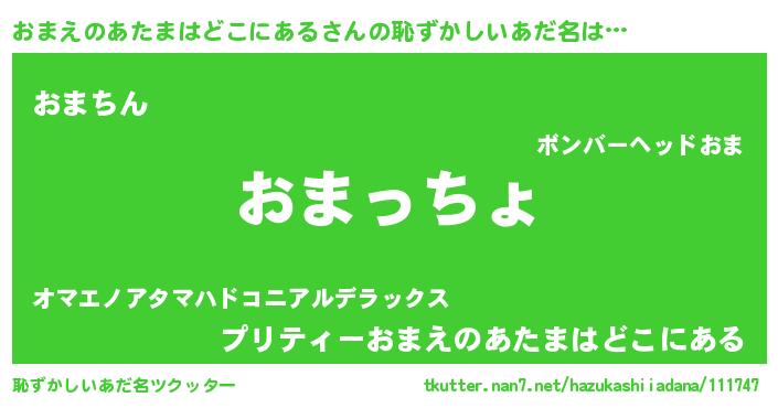 おまえのあたまはどこにあるさんの恥ずかしいあだ名は… 『おまっちょ』『おまちん』『プリティーおまえのあたまはどこにある』 ツクッター #恥ずかしいあだ名ツクッター http://tkutter.nan7.net/hazukashiiadana/111747/
