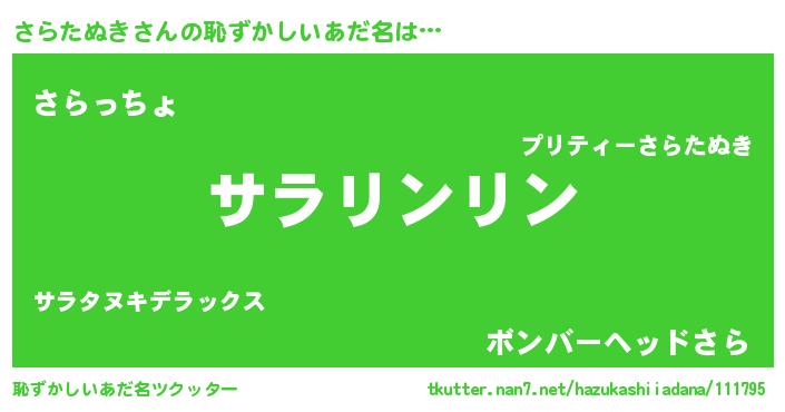 | 胡散臭い通販商品みたいなあだ名 | 『信頼と実績のサプリメント…その名も「さらたぬき」』 |