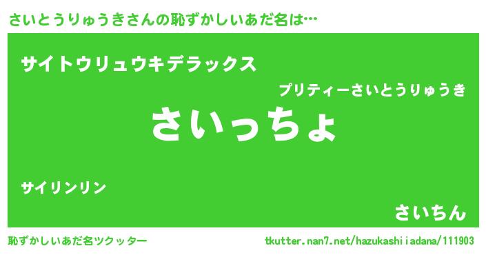 | 意味不明あだ名 | 『住所不定無職さいとうりゅうき(89歳)』 |