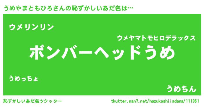 | ヘコむあだ名 | 『うめっちょ』『うめやまともひろ(笑)』 |