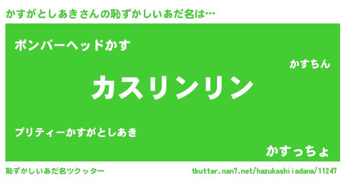 | 男性向けラノベタイトル風あだ名 | 『かすがとしあきの嫁は女の子じゃないと思った?』 |