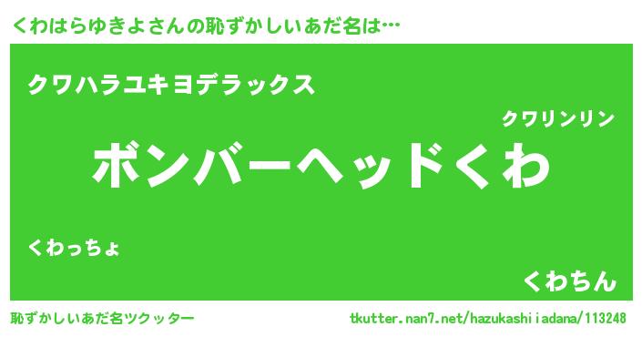 | ヘコむあだ名 | 『くわはらゆきよ(笑)』『くわっぺ』 |