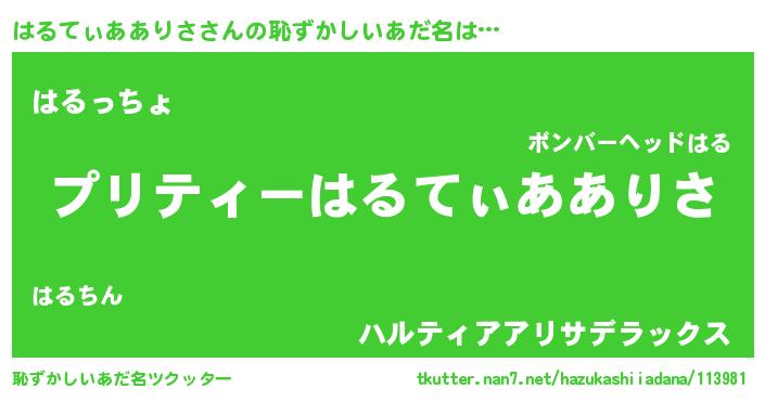 | 肩書あだ名 | 『はるてぃあありさ大佐』 |