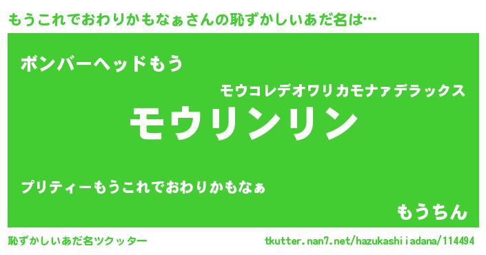 | 男性向けラノベタイトル風あだ名 | 『もうこれでおわりかもなぁの嫁は女の子じゃないと思った?』 |