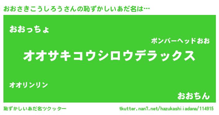 | 男性向けラノベタイトル風あだ名 | 『おおさきこうしろう~年齢イコール彼女いない歴の魔法使い~』 |