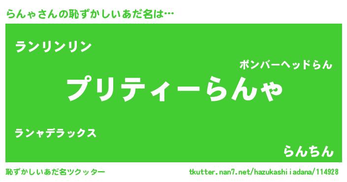 | 意味不明あだ名 | 『ニラ科らんゃ属』『ペロリンらんゃ』 |