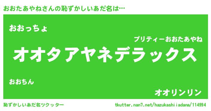 | 男性向けラノベタイトル風あだ名 | 『Re:おおたあやねから始める異世界生活』 |