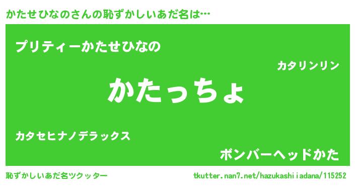 かたせひなのさんの恥ずかしいあだ名は… 『かたっちょ』『プリティーかたせひなの』『ボンバーヘッドかた』 ツクッター #恥ずかしいあだ名ツクッター http://tkutter.nan7.net/hazukashiiadana/115252/
