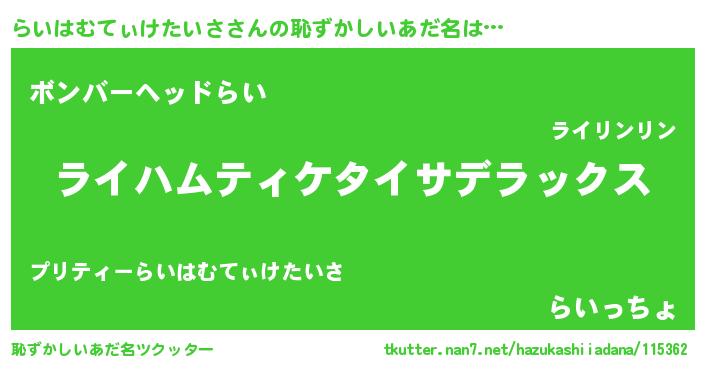 | 男性向けラノベタイトル風あだ名 | 『Re:らいはむてぃけたいさから始める異世界生活』 |